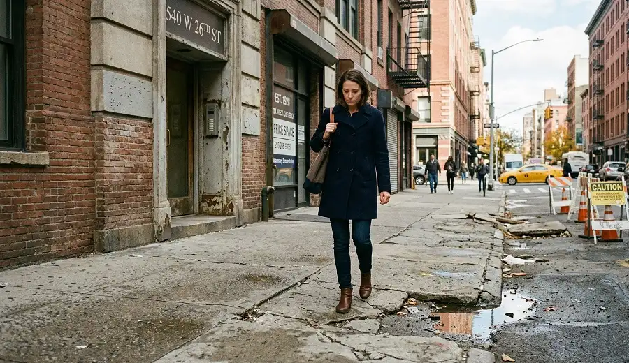 El pavimento agrietado, las losas de concreto elevadas y los bordillos rotos crean riesgos de tropezar. La responsabilidad puede recaer en los propietarios privados o en los municipios, según la ubicación.